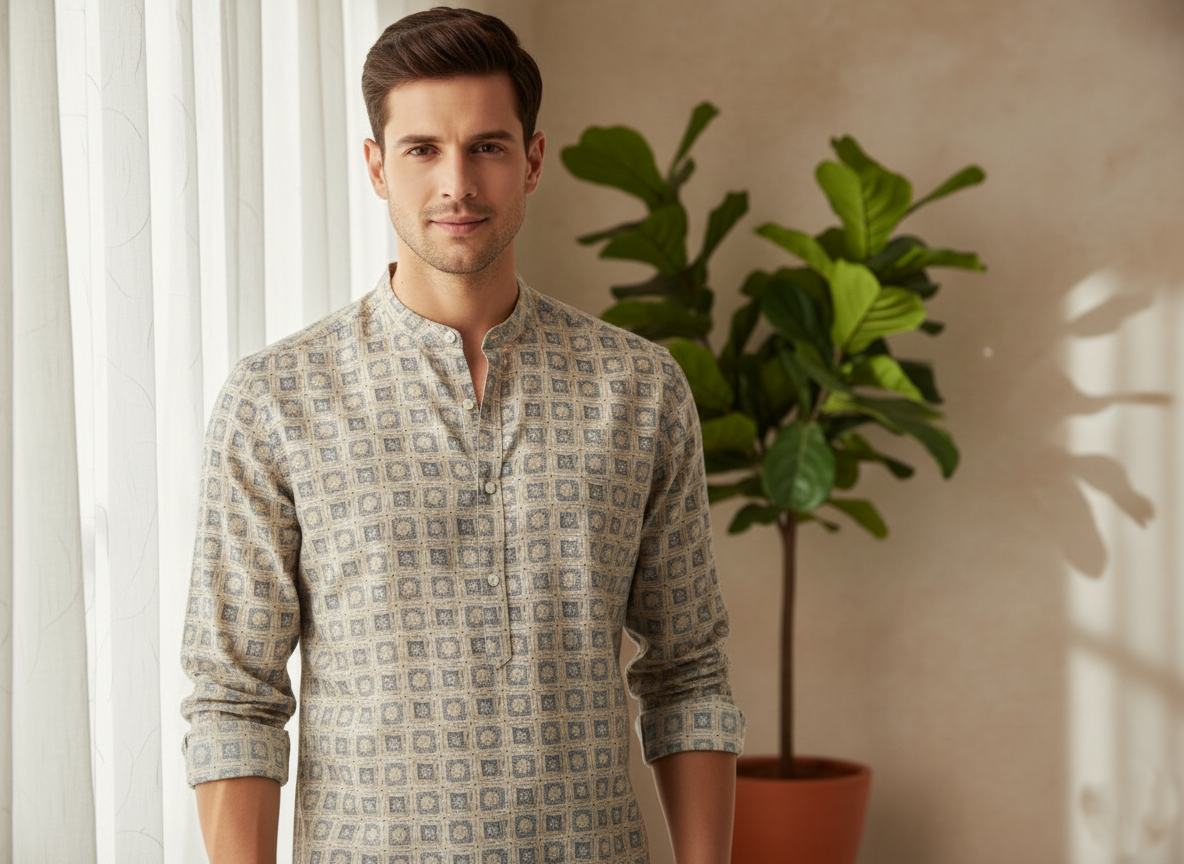 Designed with a Chinese collar, half placket, full sleeves with cuffs, and a shirt-length curved hem, it bridges the gap between traditional and modern styling.