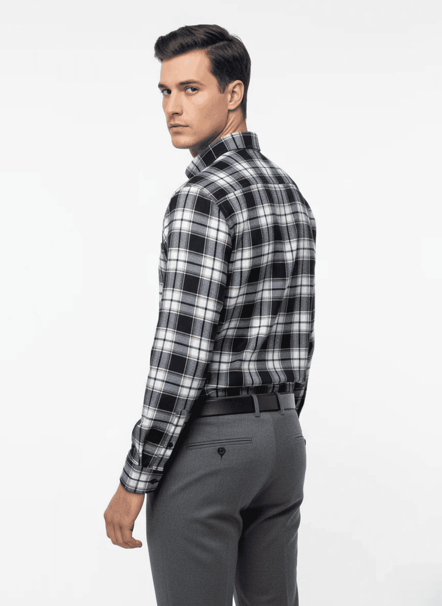 This Dark Navy checkered shirt features soft white, grey, and beige lines, creating a balanced pattern that works equally well for work, travel, or smart evenings.
